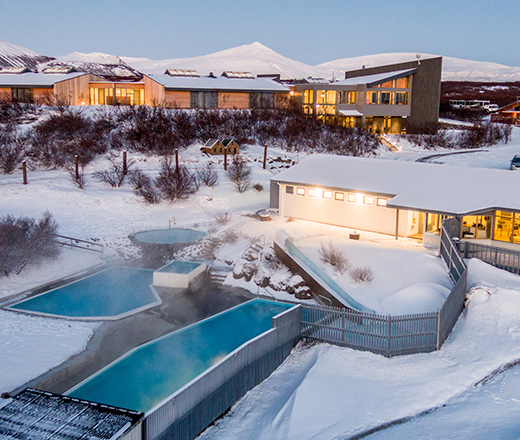 Refúgio sustentável nas Highlands islandesas, com piscinas geotermais e vistas.